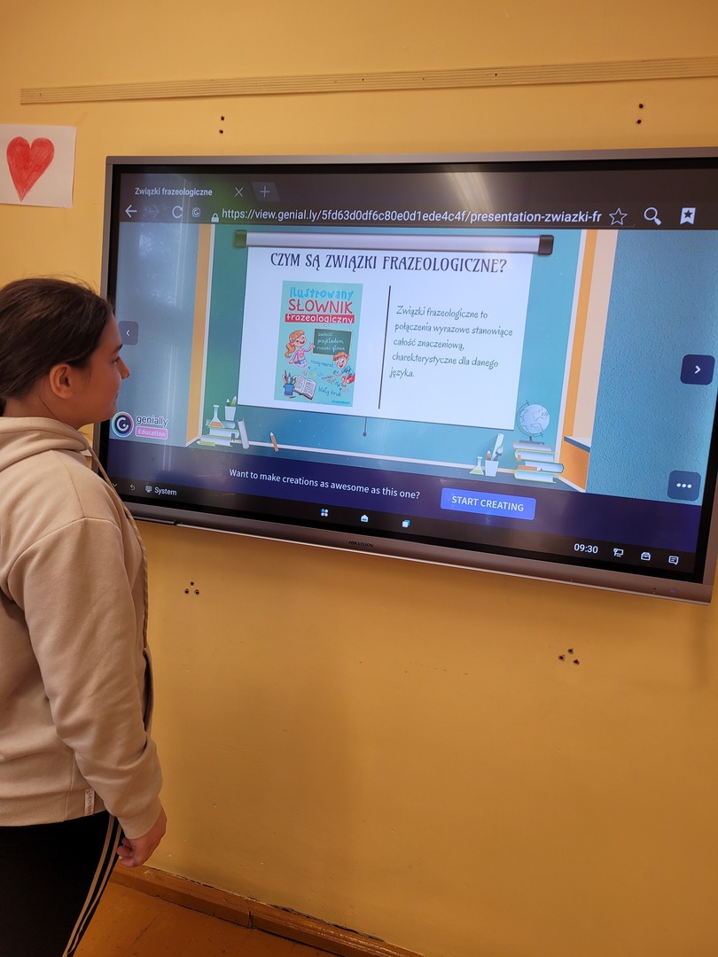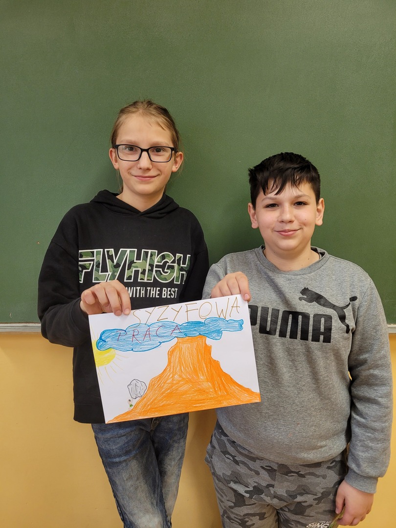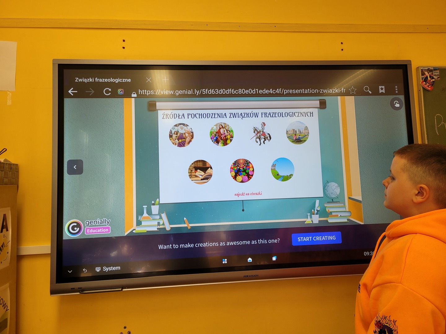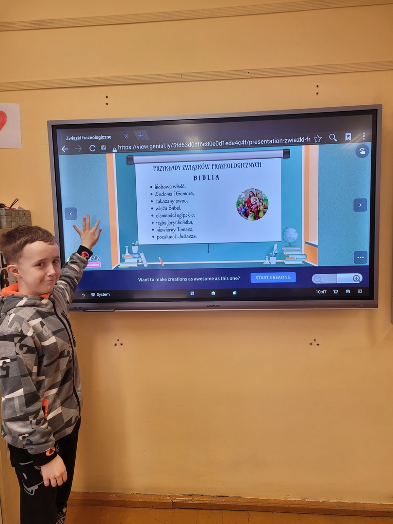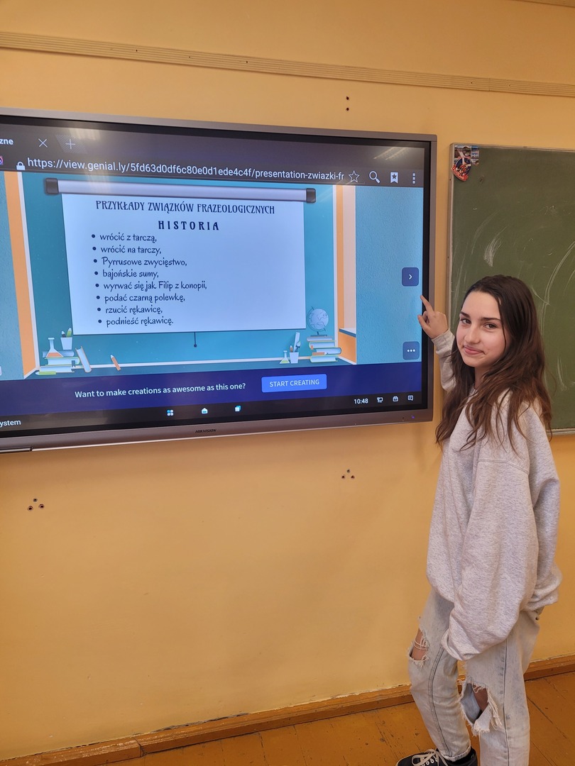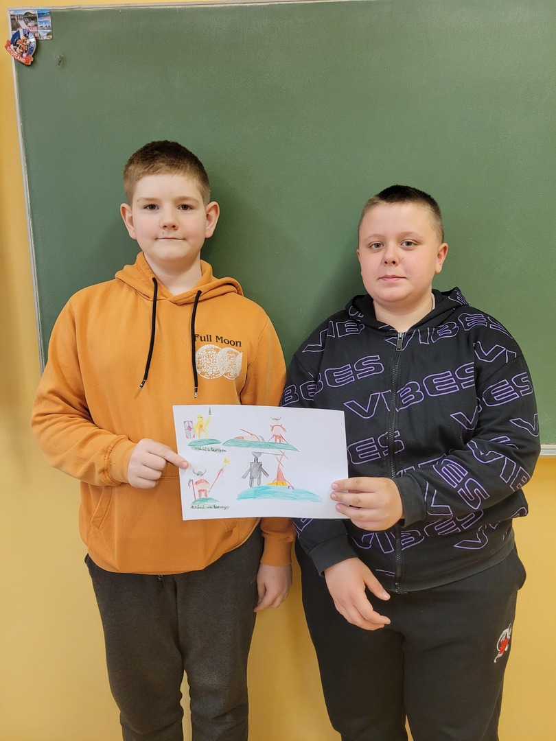 Uczniowie mieli możliwość przypomnieć sobie czym są związki frazeologiczne oraz jak się one dzielą. Dodatkowo zapoznali się ze źródłami ich pochodzenia, tj. mitologia, Biblia, historia, życie codzienne, literatura, anegdoty oraz legendy. Wypisali do każdego działu przykłady i samodzielnie znaleźli wytłumaczenie. Dzięki temu na pewno poszerzyli zakres słownictwa. Następnie zadaniem uczniów było wybranie jednego związku frazeologicznego i wykonanie do niego ilustracji. Efekty możemy podziwiać na załączonych zdjęciach.