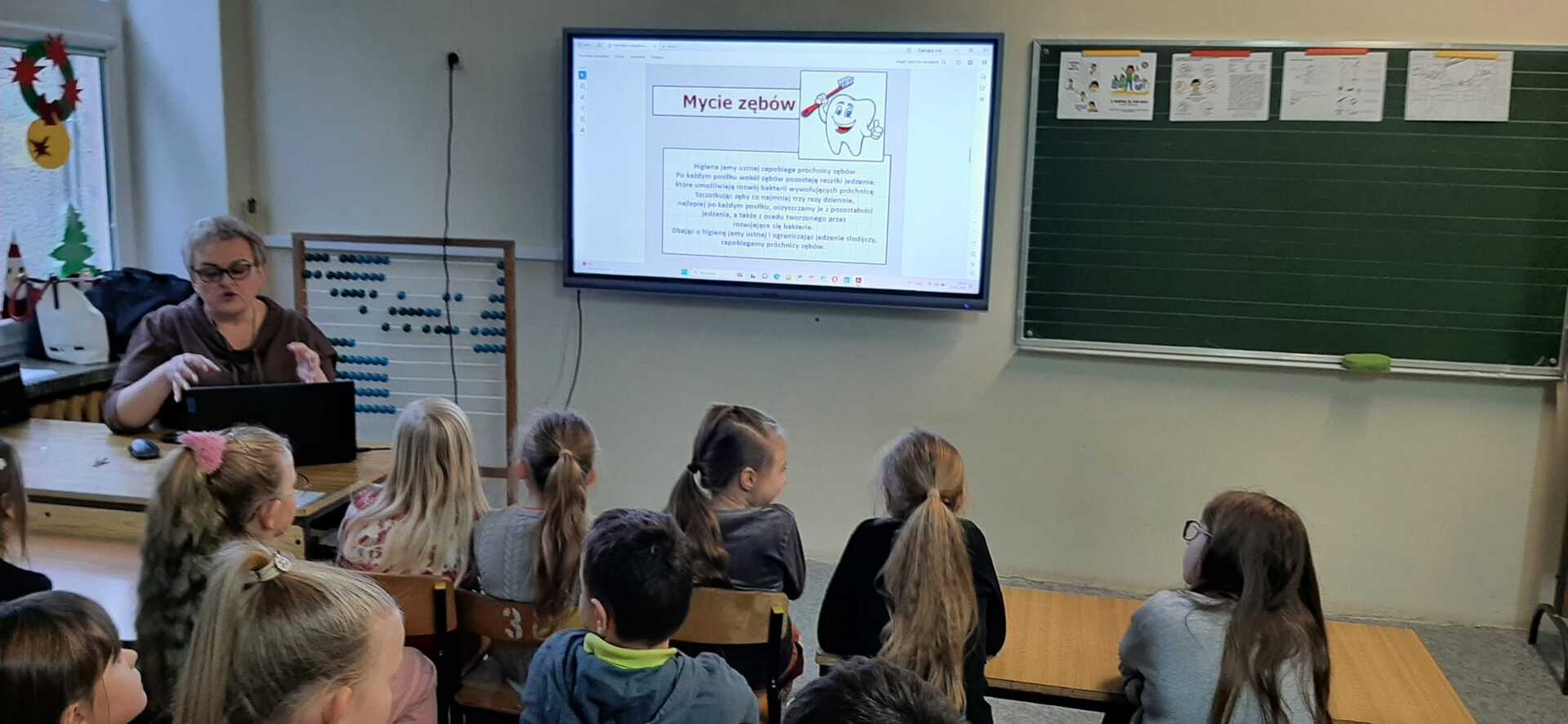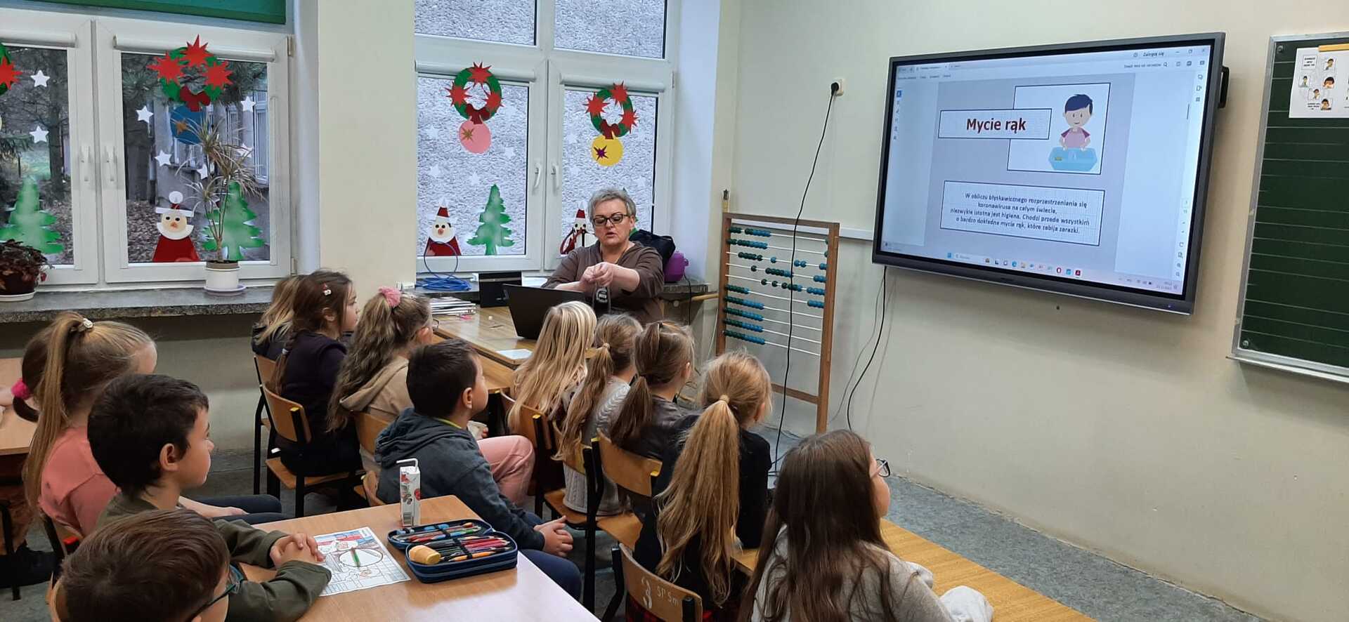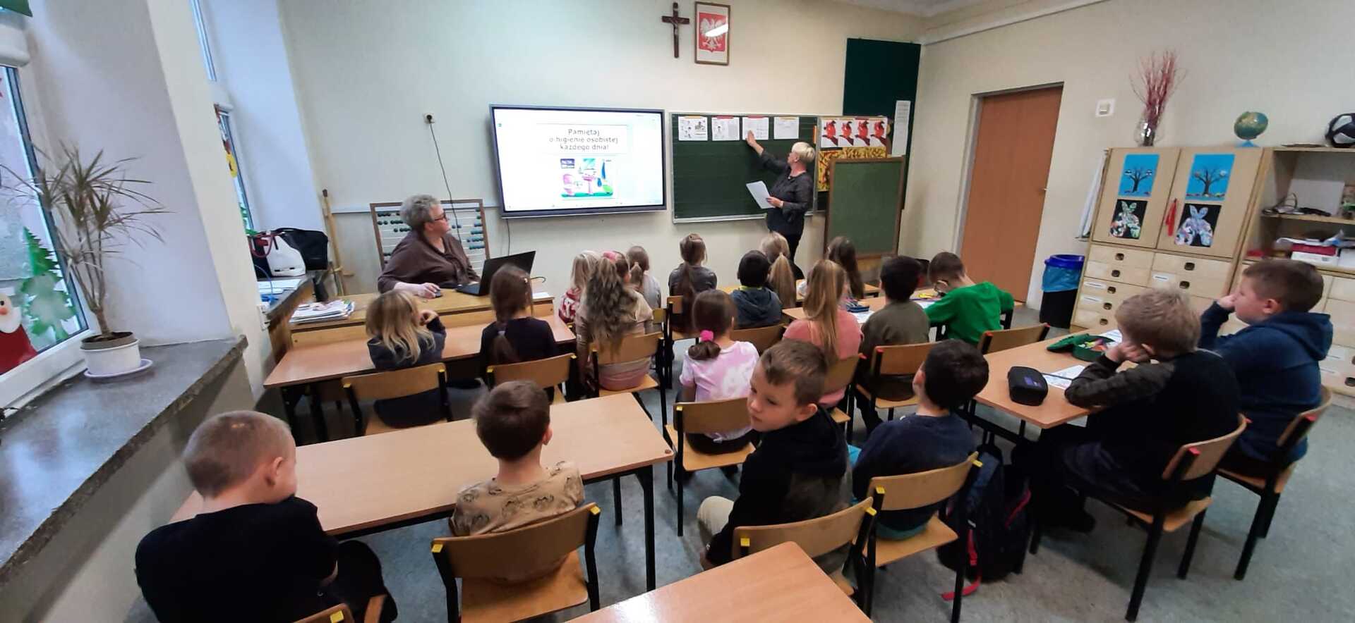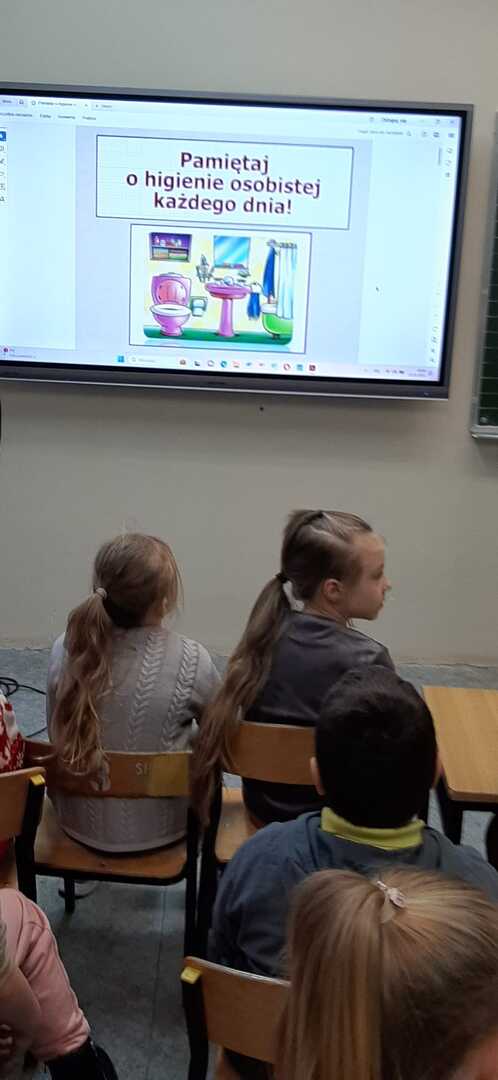 Podsumowaniem było spotkanie z pielęgniarką szkolną. Uczniowie obejrzeli prezentację, poznali zagrożenia płynące z niestosowania zasad higieny w różnych sytuacjach. Dowiedzieli się jak dbać o higienę osobistą, jakie są podstawowe zasady higieny i na czym polega higiena.