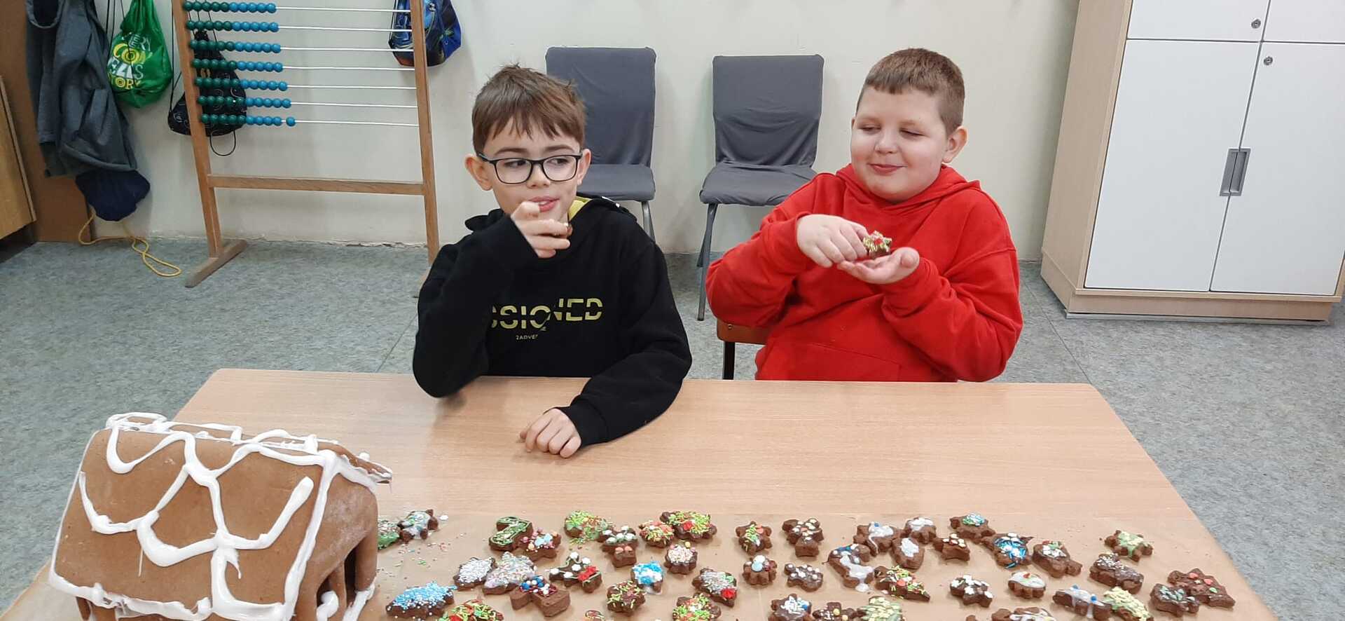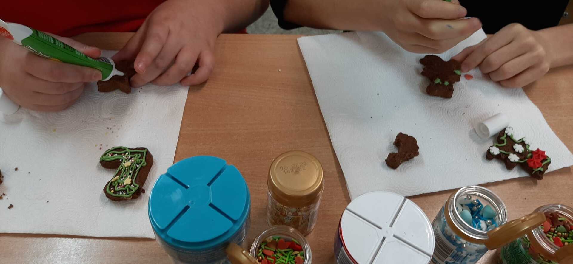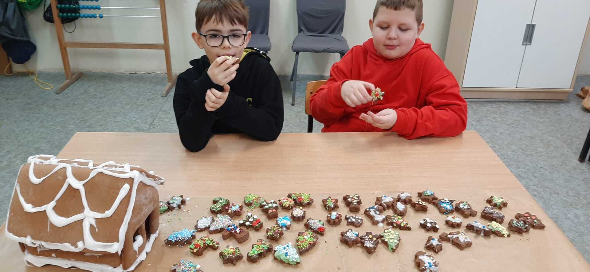„Coraz bliżej święta (…) najlepsze prezenty ukryte są w sercach”. W przedświąteczny czas każdemu zdarza się nucić kolędy i świąteczne piosenki. We wtorek 19 grudnia 2023 r. w Szkole Podstawowej w Smogórach uczniowie trzeciej klasy spędzili miło czas na kolędowaniu podczas dekorowania pierników. Otworzyli nie tylko swoje serca, ale także wykazali się wyobraźnią i precyzją podczas dekorowania wypieków lukrem, czekoladą, cukrową posypką i pisakami. Wśród piernikowych bucików, lukrowanych choinek i kolorowych gwiazdeczek, nie mogło zabraknąć piernikowej chatki, po której błyszczący lukier spływał jak śnieg w słoneczny zimowy dzień. Zabawa była doskonała, a zwieńczeniem warsztatów była degustacja przepięknie ozdobionych pierniczków. Szczególne podziękowania kieruję do Rodziców, którzy zaopatrzyli nas w słodkie ozdoby, cukrowe pisaki i błyszczący lukier.