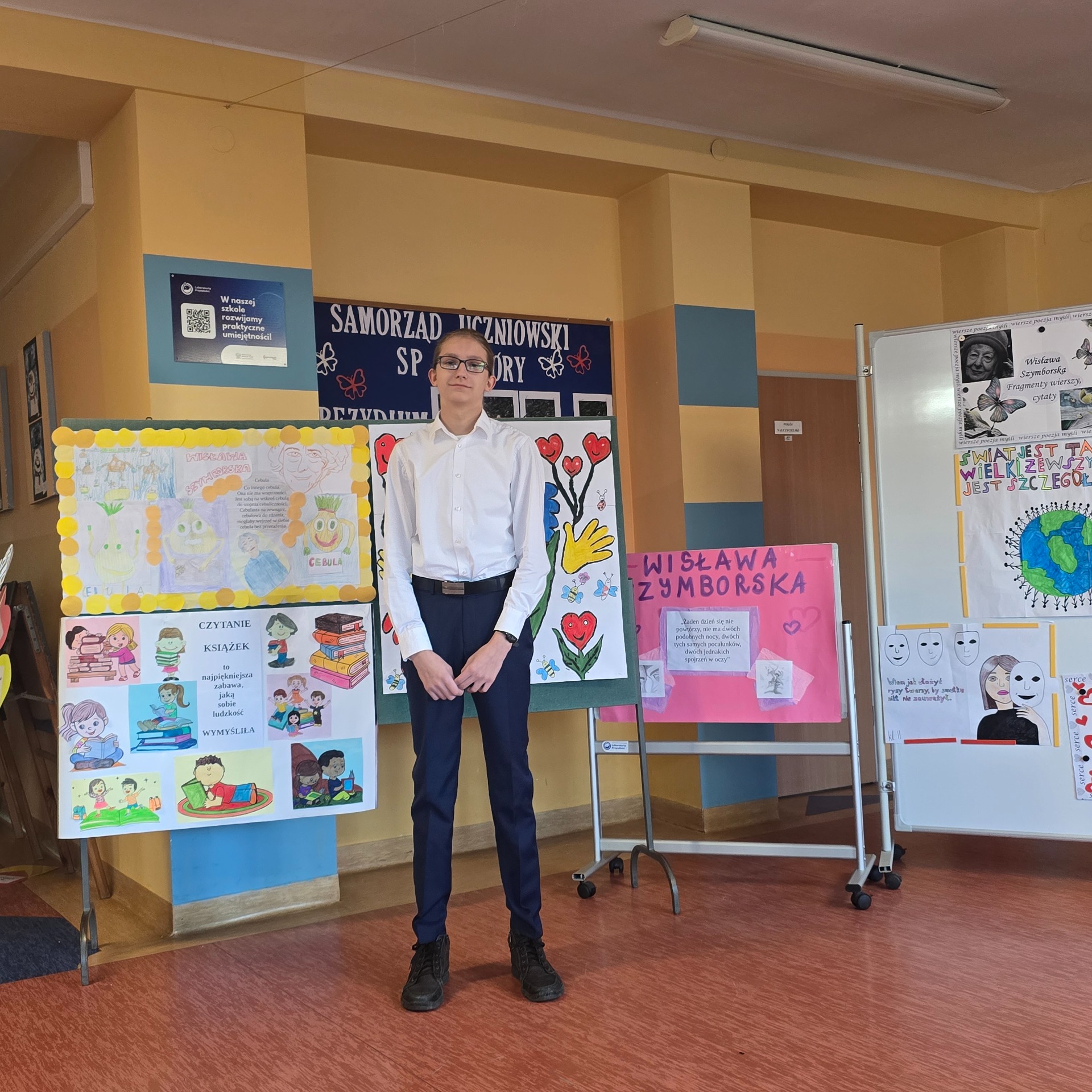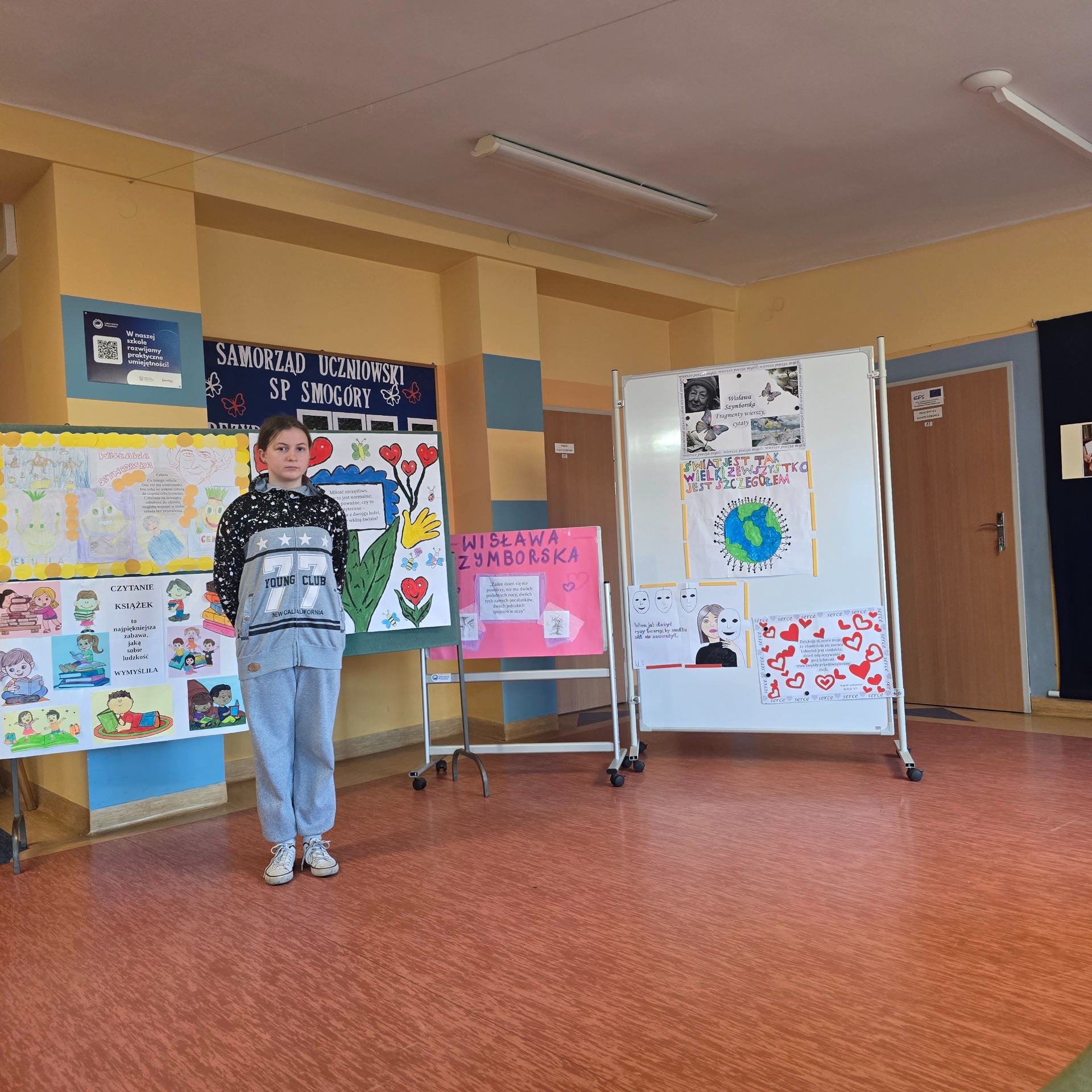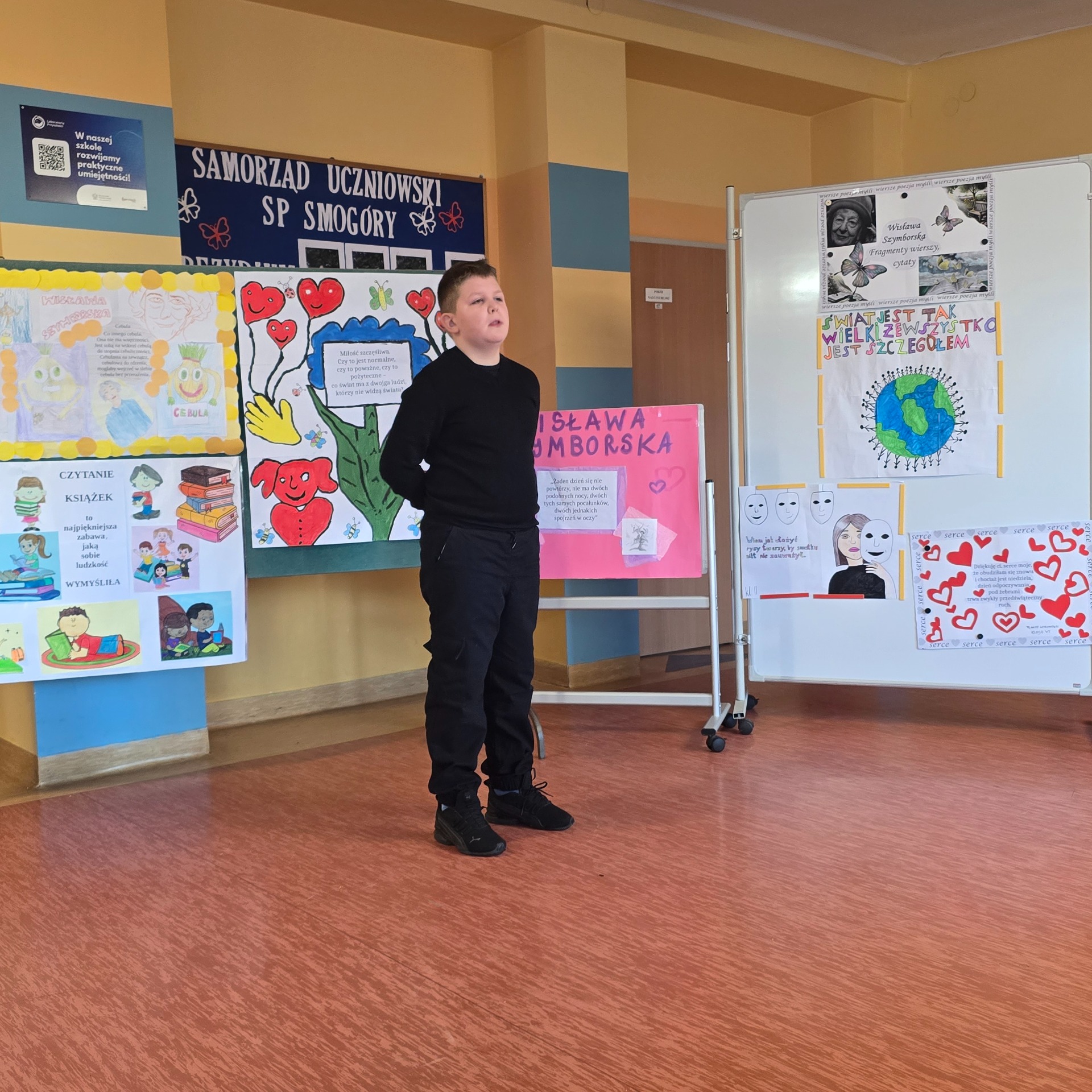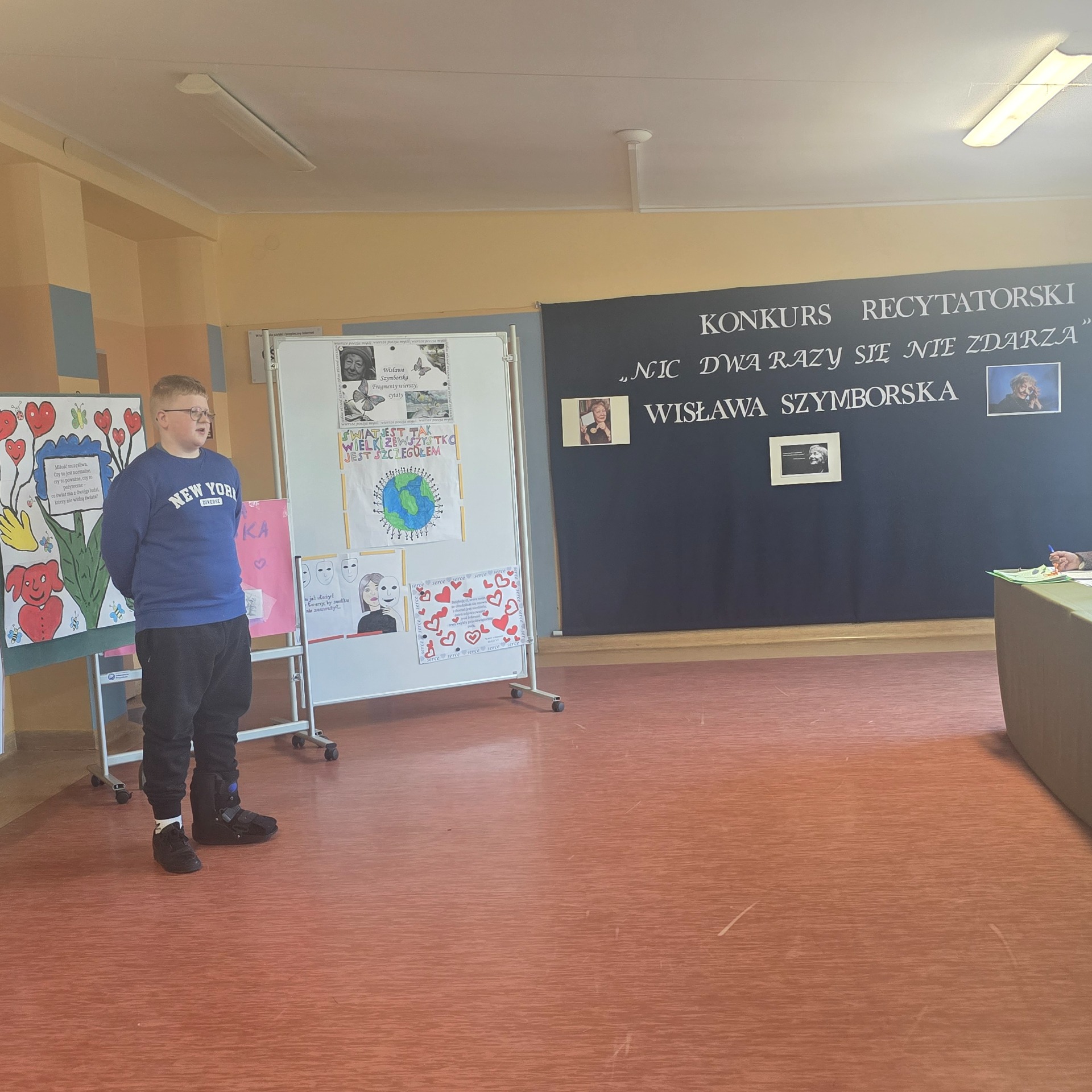 W ramach poznawania naszej przyszłej patronki uczniowie oglądają także reportaże o poetce oraz biorą udział w lekcjach poświęconych jej twórczości. Natomiast 6 marca 2025 r. odbył się konkurs recytatorski dla klas III – VIII. Uczniowie deklamowali wiersze Wisławy Szymborskiej. Celem tego wydarzenia było przede wszystkim zainteresowanie poezją, a także zachęcenie do występów przed publicznością! Wszyscy uczestnicy zaprezentowali swoje niebywałe umiejętności, doskonałą pamięć, wzorową intonację oraz dykcję.