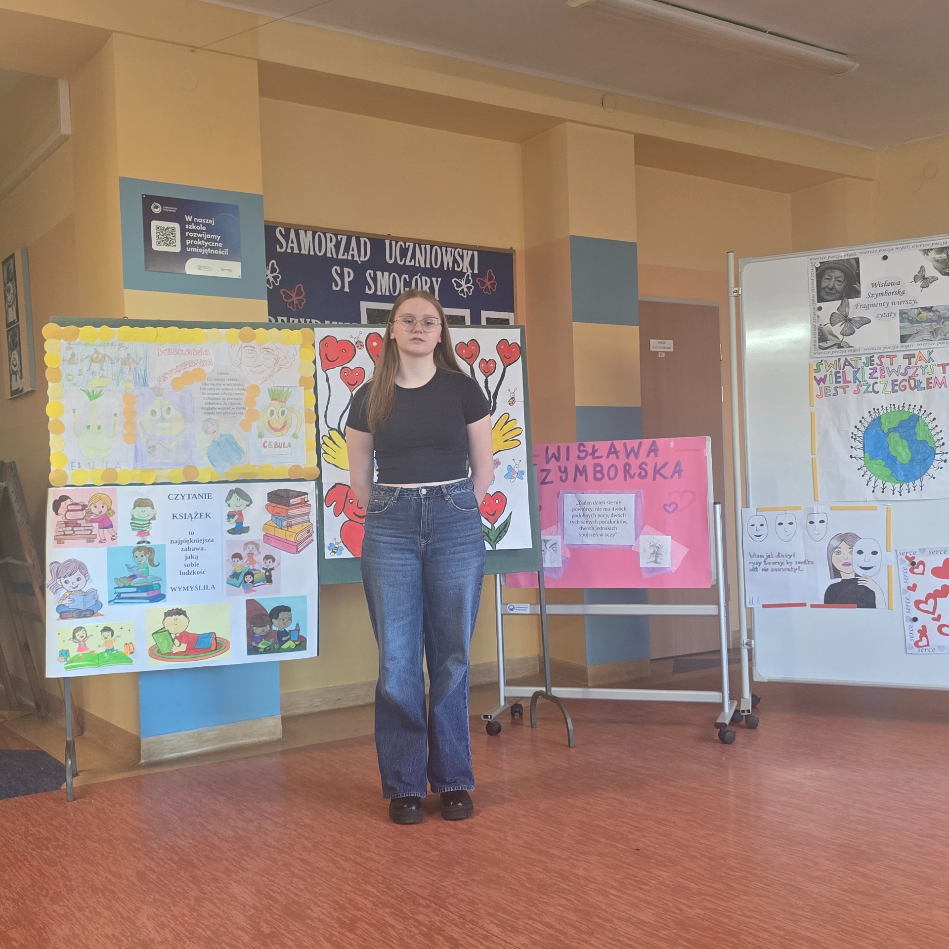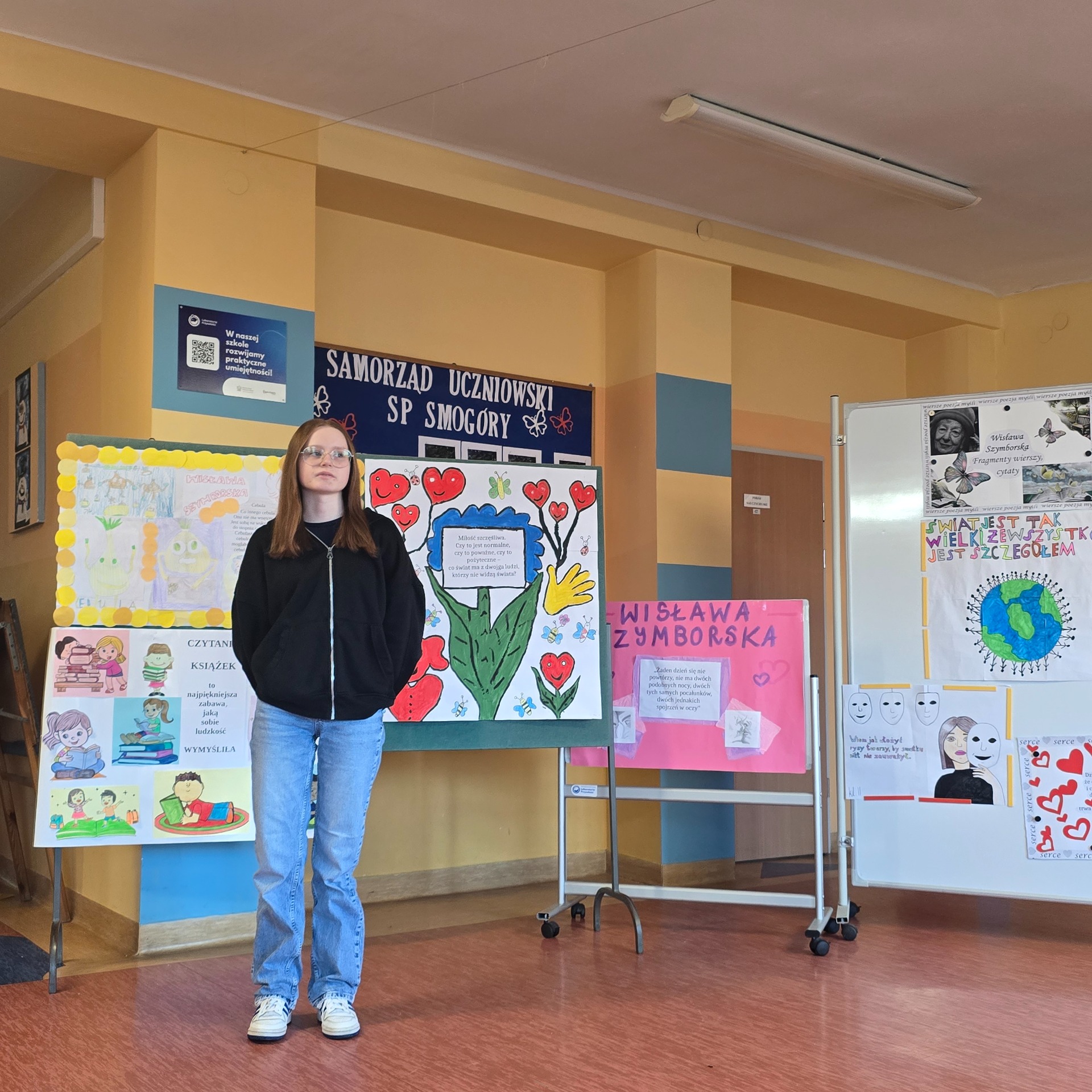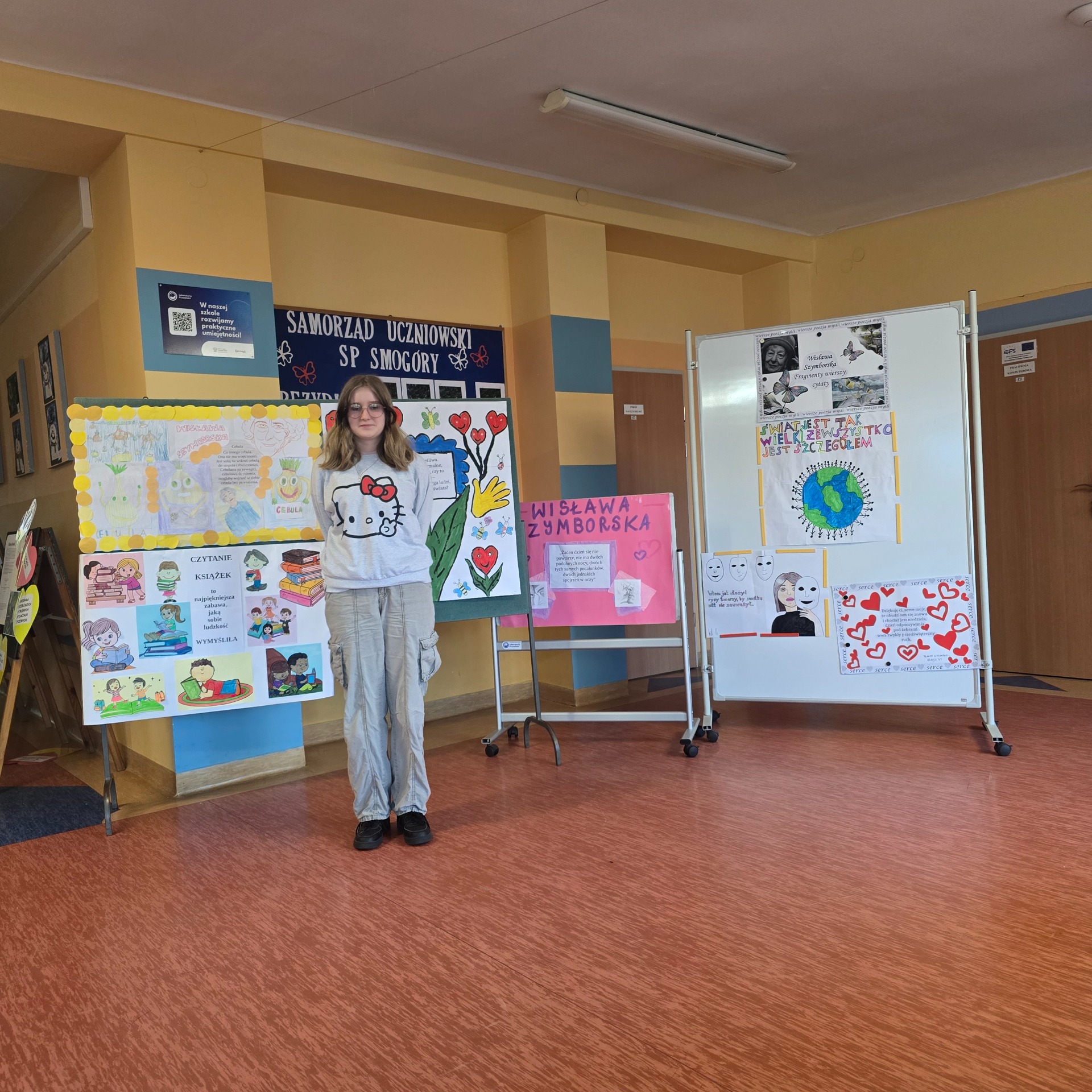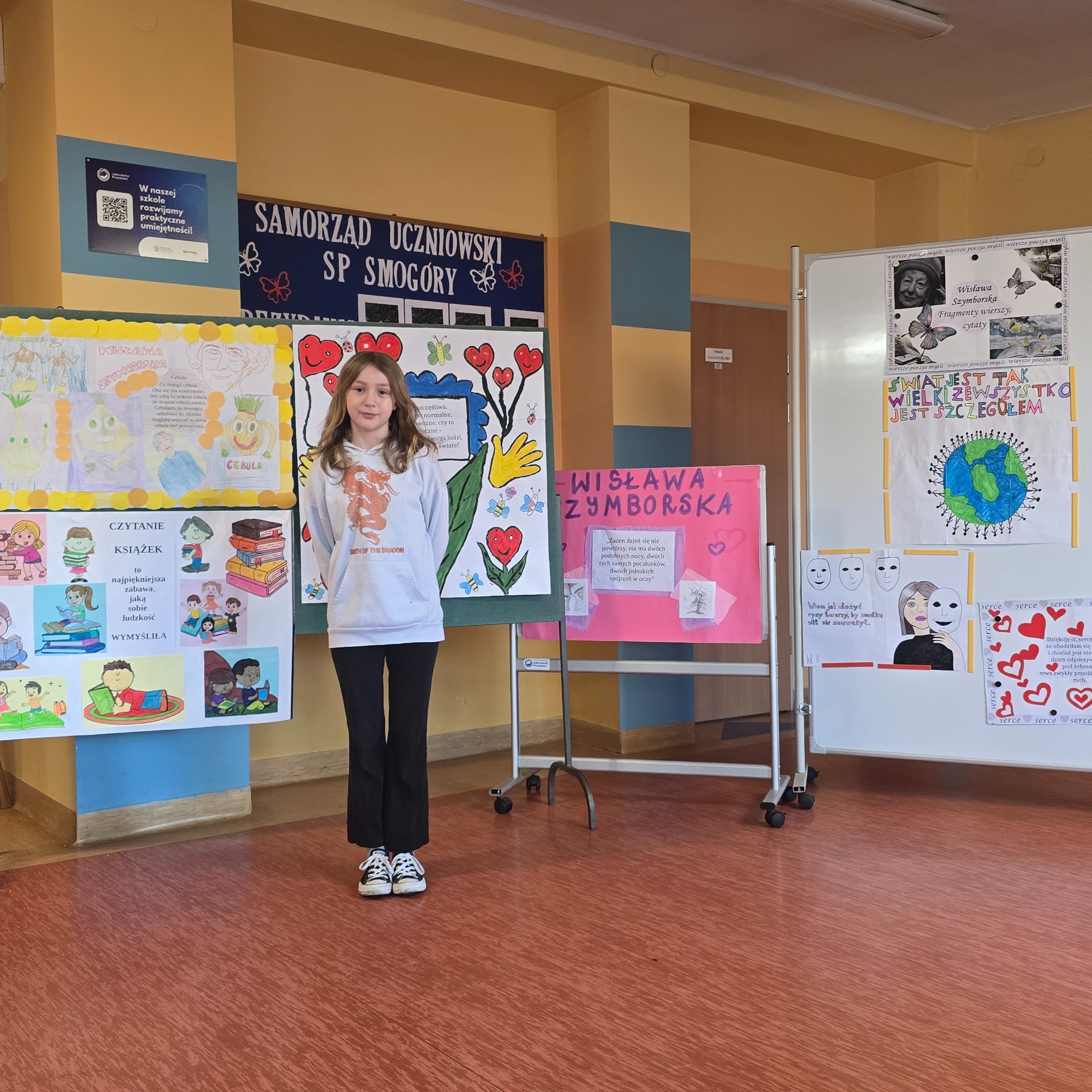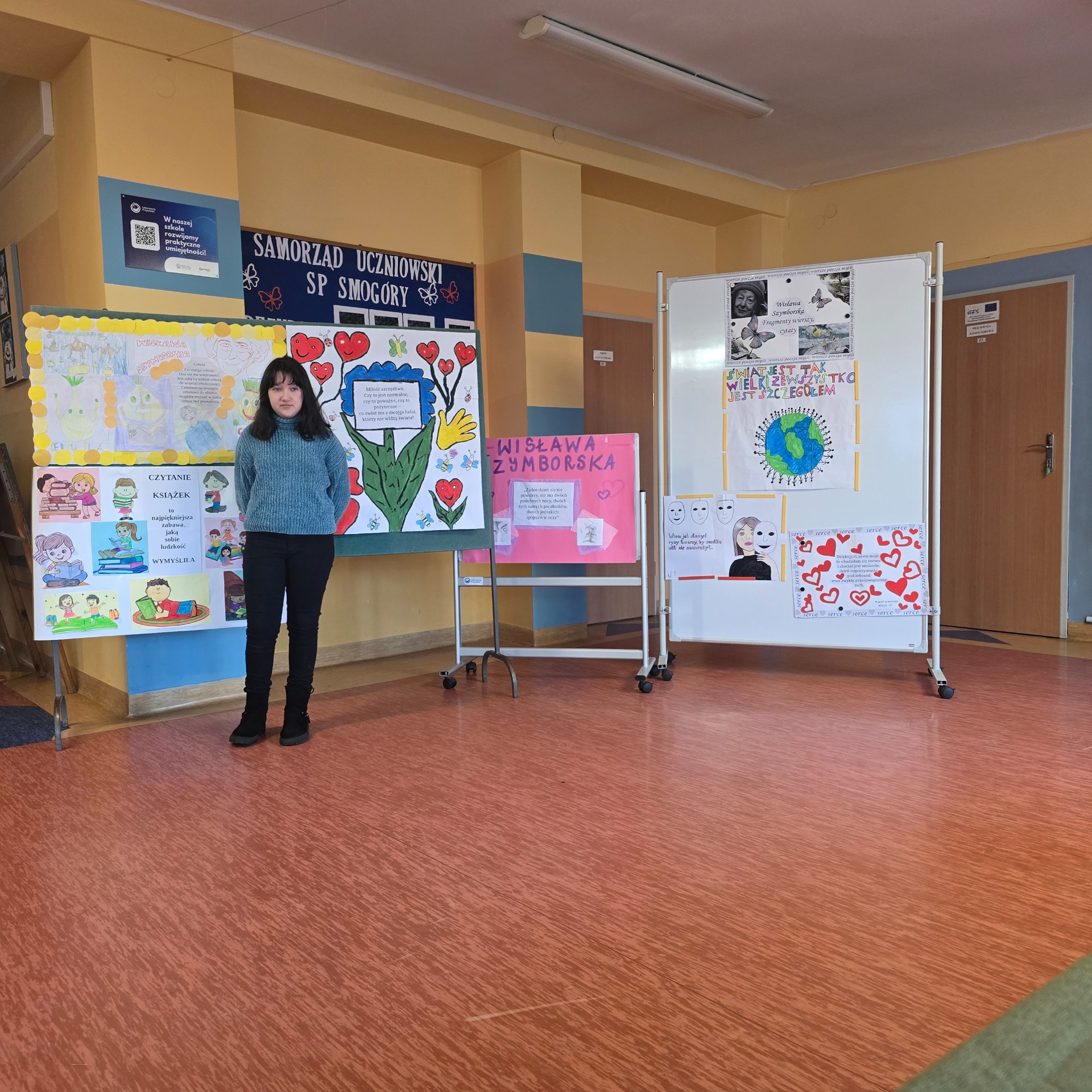 Po wyborach patrona Szkoły Podstawowej w Smogórach, które odbyły się 13 listopada 2024 roku nastąpił czas na przybliżenie uczniom postaci Wisławy Szymborskiej, a także na zapoznanie ich z historią życia oraz twórczością poetki. Jest dla nas jedną z najwybitniejszych polskich poetek – otrzymała Nagrodę Nobla w dziedzinie literatury, dlatego bez dwóch zdań zasługuje na miano patronki polskiej szkoły. Chcąc poznać bliżej Wisławę Szymborską oraz jej twórczość poszczególne klasy (od pierwszej do ósmej) wykonały plakaty ilustrujące fragmenty wierszy lub jej myśli. Prace uczniów zostały wyeksponowane w holu szkoły. Natomiast klasa szósta dodatkowo wykonała album zatytułowany ,,Wiersze wybrane”, w którym zamieszono utwory wraz z własnoręcznie wykonanymi ilustracjami. Po pierwsze, z jej twórczości wynika głębokie zrozumienie ludzkiej natury, umiejętność zadawania właściwych pytań o sens życia, miłości i istnienia. Dzięki temu, jej poezja zainspirowała nas do stworzenia ciekawej kolekcji wierszy, które wspólnie mogliśmy czytać. Po drugie, Wisława Szymborska to mistrzyni słowa, od której uczniowie mogą uczyć się wyrażania własnych myśli i emocji. Ceniła sobie niezależność myślenia i krytyczne podejście do rzeczywistości, czyli wartości ważne w edukacji, ponieważ pomagają młodemu człowiekowi stać się samodzielnym. Życie i twórczość Szymborskiej są też doskonałym przykładem, jak zaangażowanie i pasja mogą prowadzić do osiągnięcia wielkich rzeczy. To wzór dla uczniów, którzy mogą upewnić się, że warto spełniać marzenia i nauczyć się nie bać wyrażać siebie.