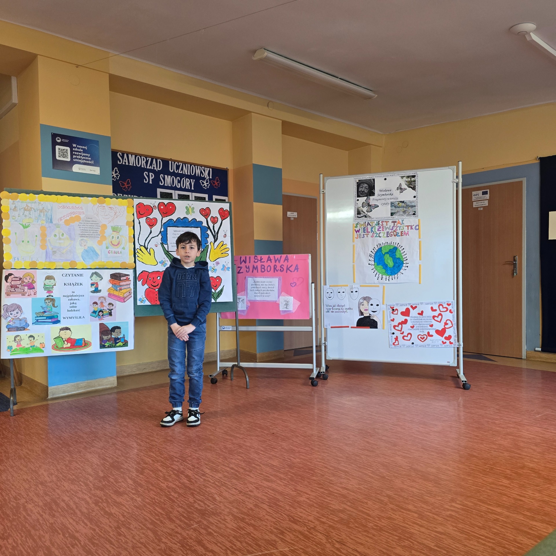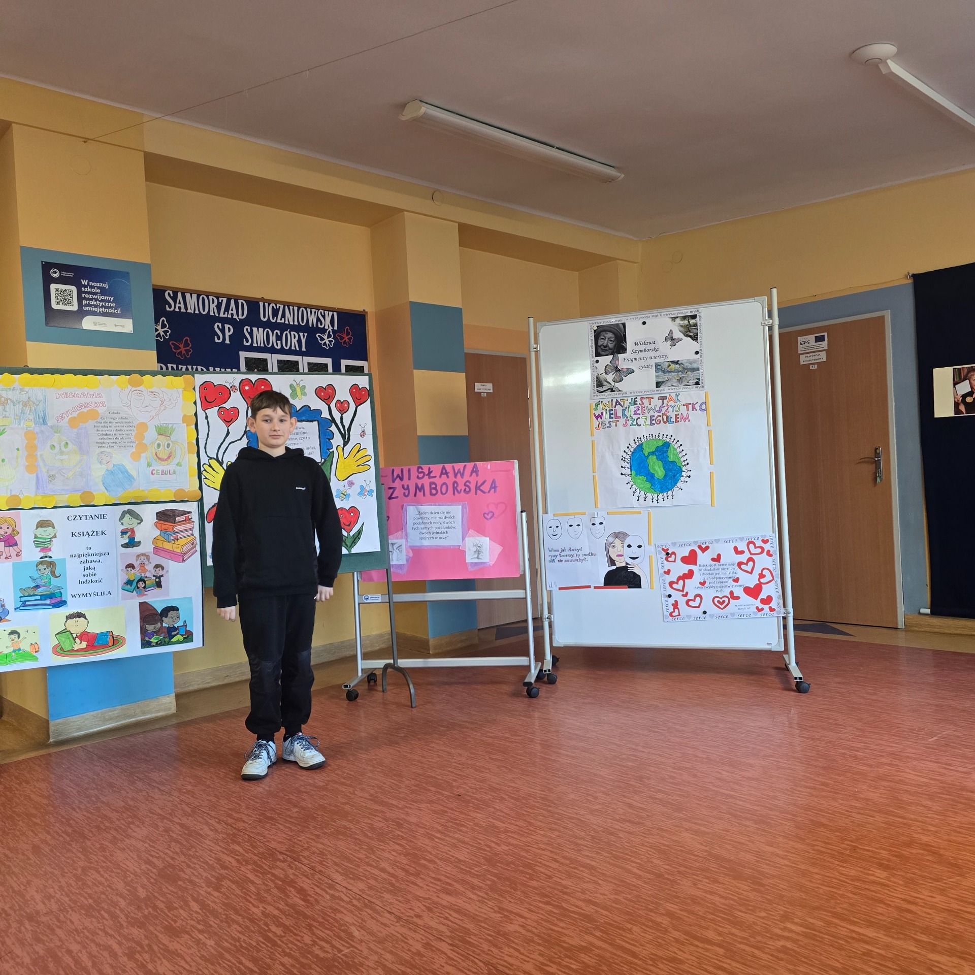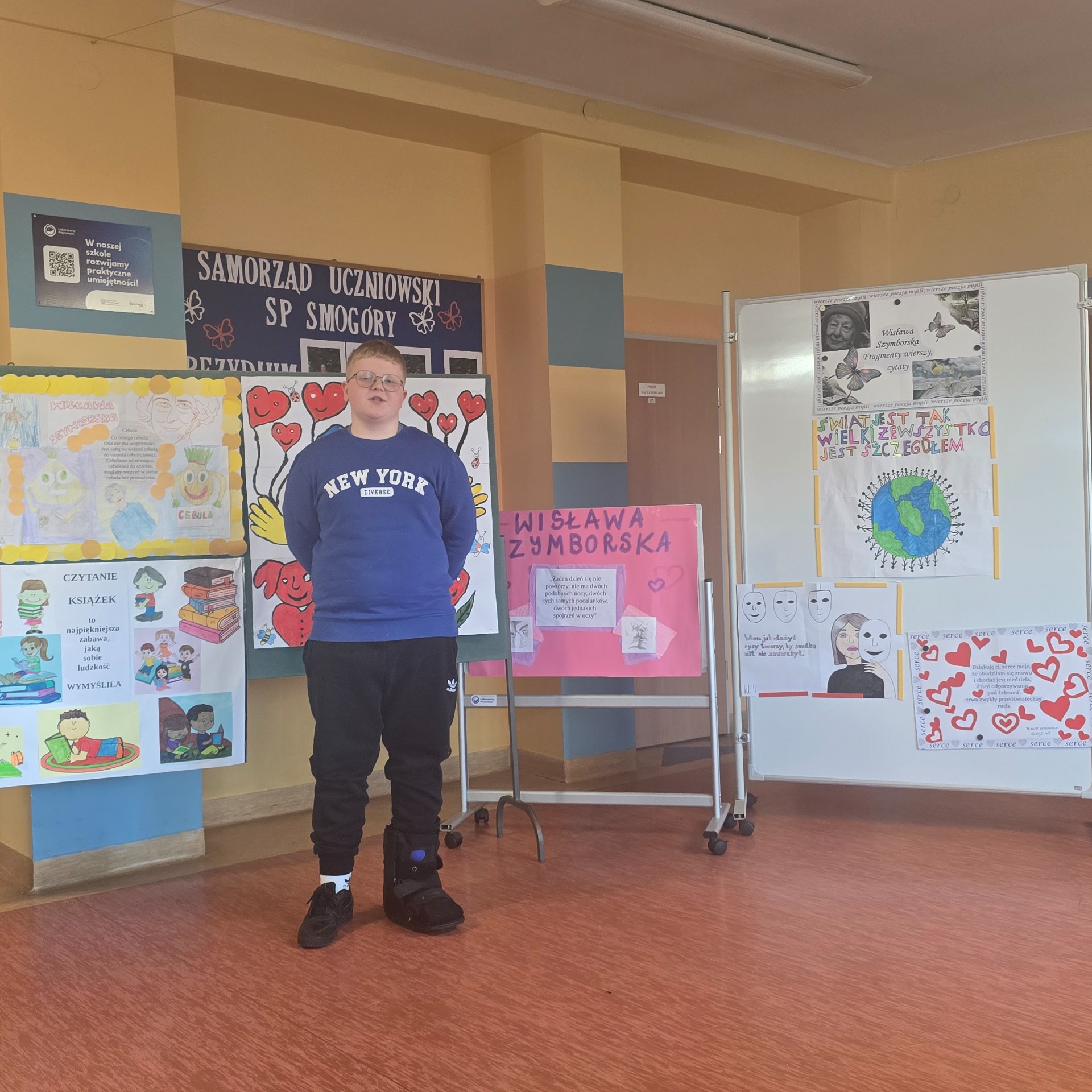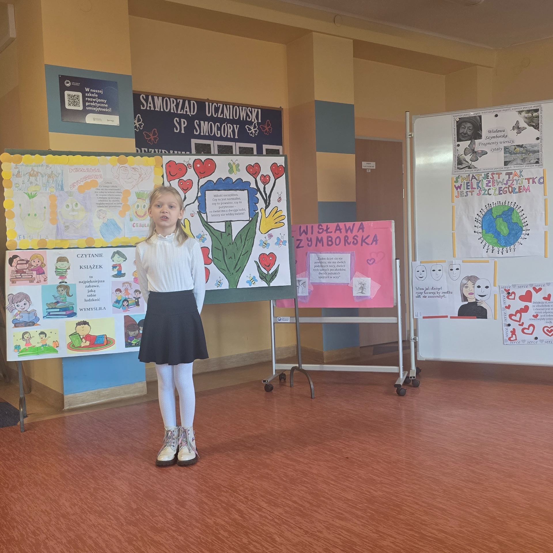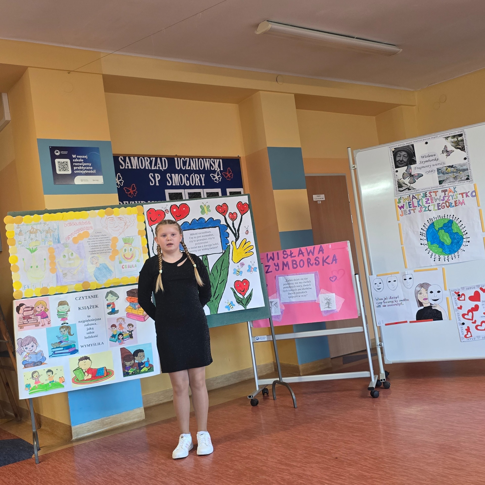 Po wyborach patrona Szkoły Podstawowej w Smogórach, które odbyły się 13 listopada 2024 roku nastąpił czas na przybliżenie uczniom postaci Wisławy Szymborskiej, a także na zapoznanie ich z historią życia oraz twórczością poetki. Jest dla nas jedną z najwybitniejszych polskich poetek – otrzymała Nagrodę Nobla w dziedzinie literatury, dlatego bez dwóch zdań zasługuje na miano patronki polskiej szkoły. Chcąc poznać bliżej Wisławę Szymborską oraz jej twórczość poszczególne klasy (od pierwszej do ósmej) wykonały plakaty ilustrujące fragmenty wierszy lub jej myśli. Prace uczniów zostały wyeksponowane w holu szkoły. Natomiast klasa szósta dodatkowo wykonała album zatytułowany ,,Wiersze wybrane”, w którym zamieszono utwory wraz z własnoręcznie wykonanymi ilustracjami. Po pierwsze, z jej twórczości wynika głębokie zrozumienie ludzkiej natury, umiejętność zadawania właściwych pytań o sens życia, miłości i istnienia. Dzięki temu, jej poezja zainspirowała nas do stworzenia ciekawej kolekcji wierszy, które wspólnie mogliśmy czytać. Po drugie, Wisława Szymborska to mistrzyni słowa, od której uczniowie mogą uczyć się wyrażania własnych myśli i emocji. Ceniła sobie niezależność myślenia i krytyczne podejście do rzeczywistości, czyli wartości ważne w edukacji, ponieważ pomagają młodemu człowiekowi stać się samodzielnym. Życie i twórczość Szymborskiej są też doskonałym przykładem, jak zaangażowanie i pasja mogą prowadzić do osiągnięcia wielkich rzeczy. To wzór dla uczniów, którzy mogą upewnić się, że warto spełniać marzenia i nauczyć się nie bać wyrażać siebie.