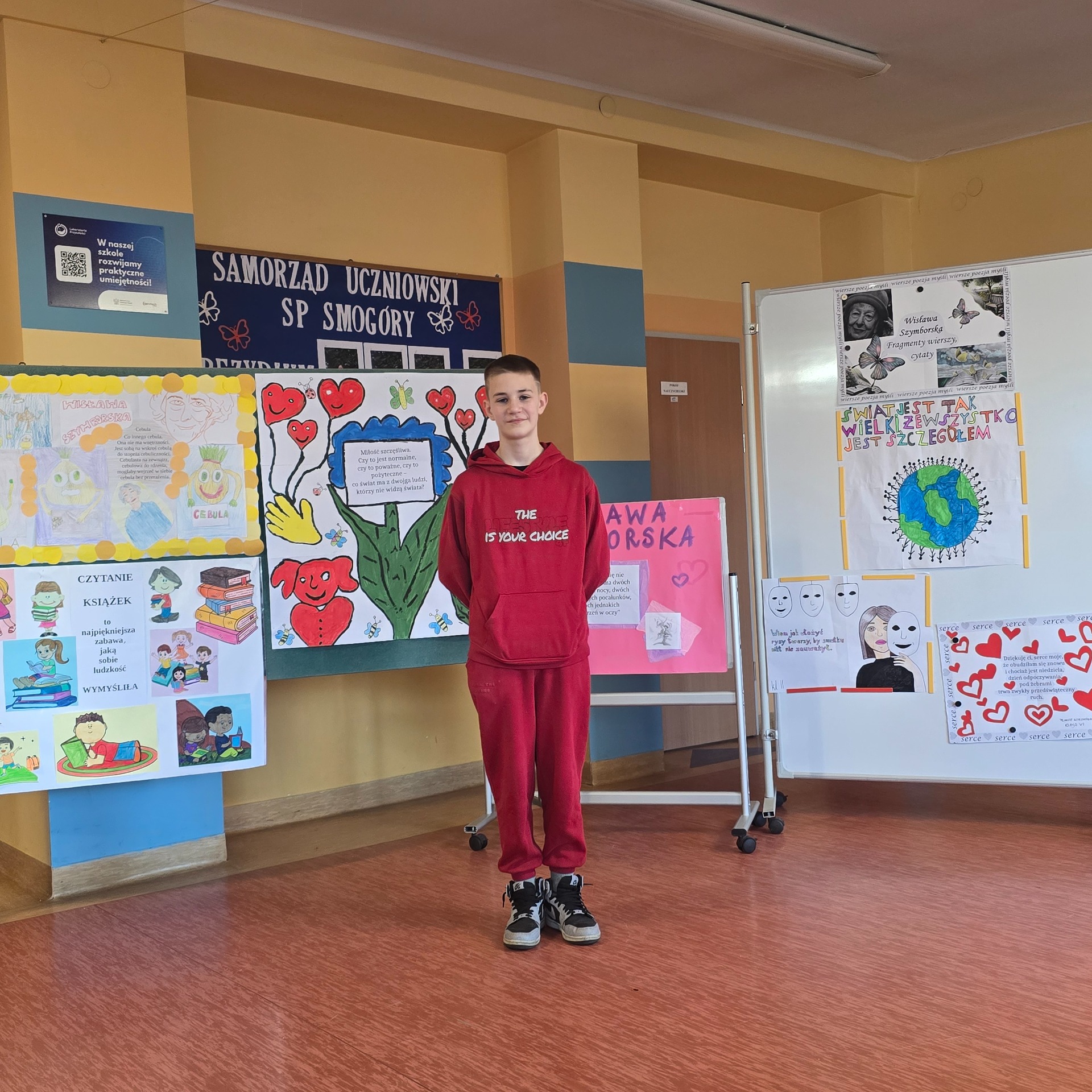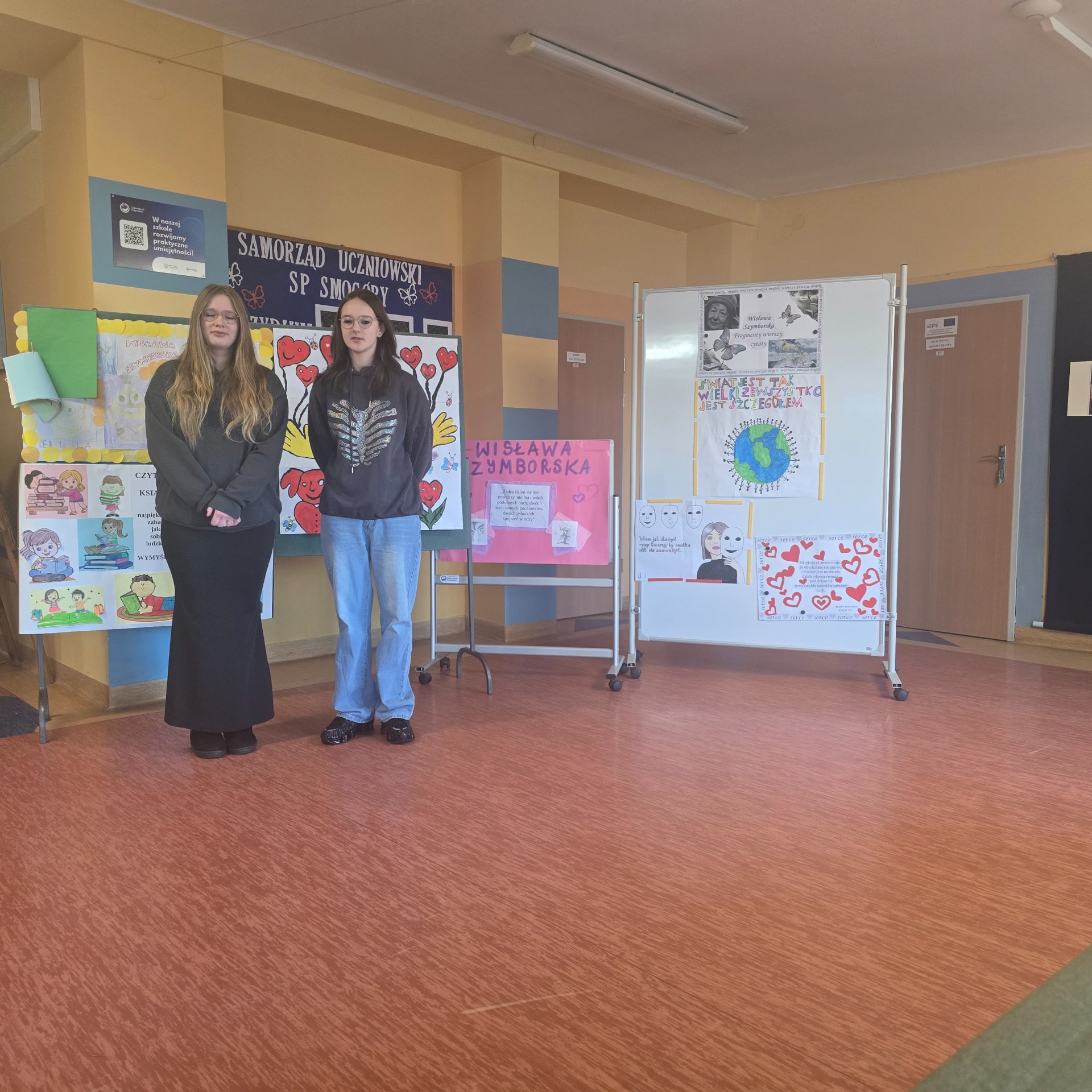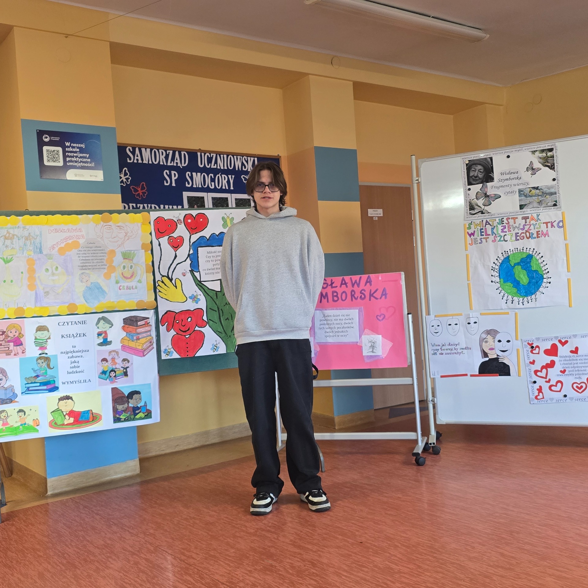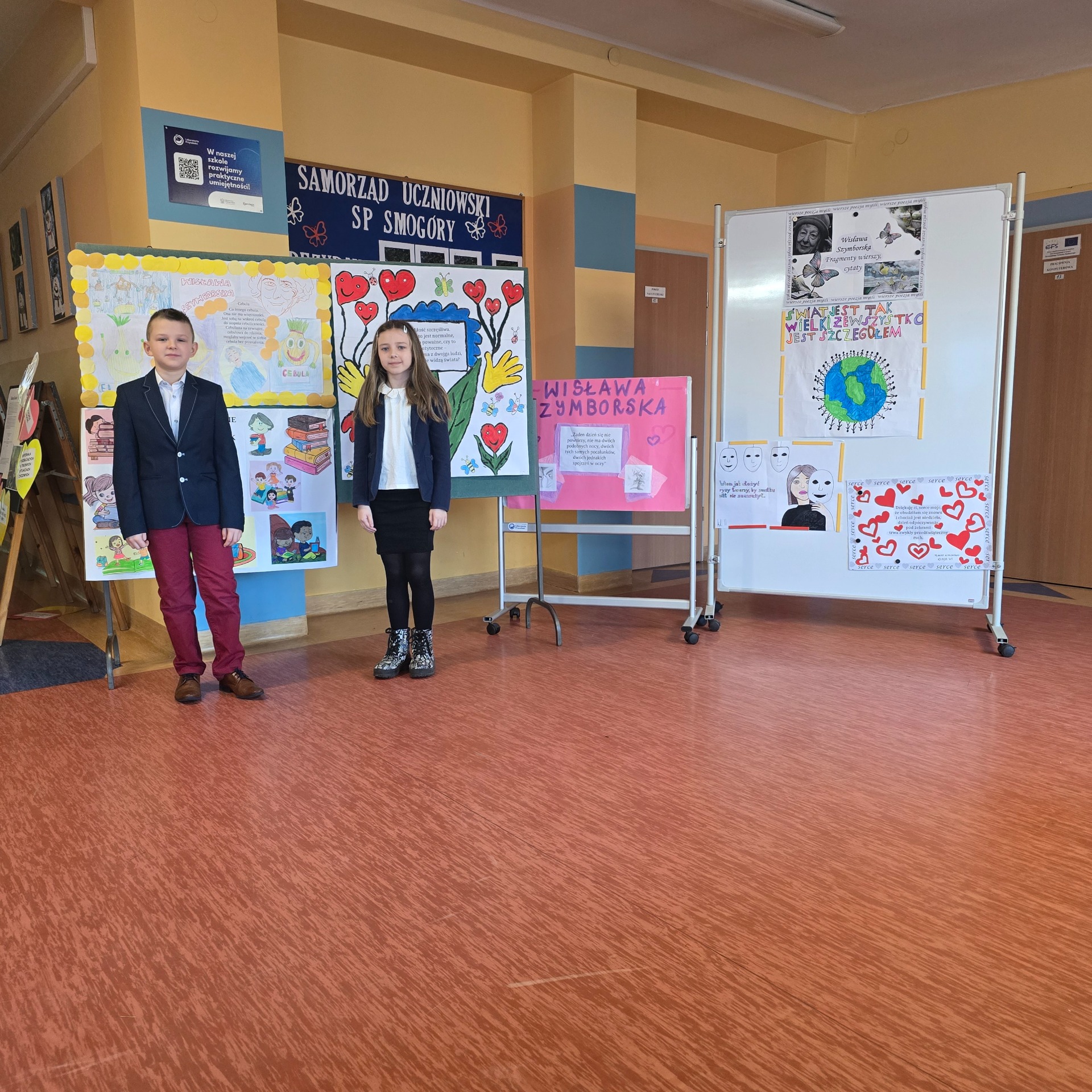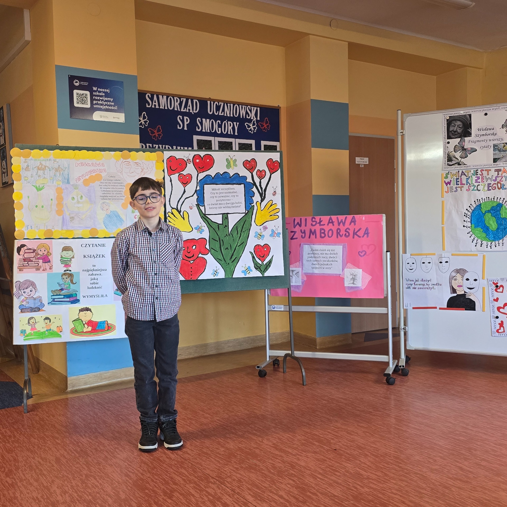 Po wyborach patrona Szkoły Podstawowej w Smogórach, które odbyły się 13 listopada 2024 roku nastąpił czas na przybliżenie uczniom postaci Wisławy Szymborskiej, a także na zapoznanie ich z historią życia oraz twórczością poetki. Jest dla nas jedną z najwybitniejszych polskich poetek – otrzymała Nagrodę Nobla w dziedzinie literatury, dlatego bez dwóch zdań zasługuje na miano patronki polskiej szkoły. Chcąc poznać bliżej Wisławę Szymborską oraz jej twórczość poszczególne klasy (od pierwszej do ósmej) wykonały plakaty ilustrujące fragmenty wierszy lub jej myśli. Prace uczniów zostały wyeksponowane w holu szkoły. Natomiast klasa szósta dodatkowo wykonała album zatytułowany ,,Wiersze wybrane”, w którym zamieszono utwory wraz z własnoręcznie wykonanymi ilustracjami. Po pierwsze, z jej twórczości wynika głębokie zrozumienie ludzkiej natury, umiejętność zadawania właściwych pytań o sens życia, miłości i istnienia. Dzięki temu, jej poezja zainspirowała nas do stworzenia ciekawej kolekcji wierszy, które wspólnie mogliśmy czytać. Po drugie, Wisława Szymborska to mistrzyni słowa, od której uczniowie mogą uczyć się wyrażania własnych myśli i emocji. Ceniła sobie niezależność myślenia i krytyczne podejście do rzeczywistości, czyli wartości ważne w edukacji, ponieważ pomagają młodemu człowiekowi stać się samodzielnym. Życie i twórczość Szymborskiej są też doskonałym przykładem, jak zaangażowanie i pasja mogą prowadzić do osiągnięcia wielkich rzeczy. To wzór dla uczniów, którzy mogą upewnić się, że warto spełniać marzenia i nauczyć się nie bać wyrażać siebie.