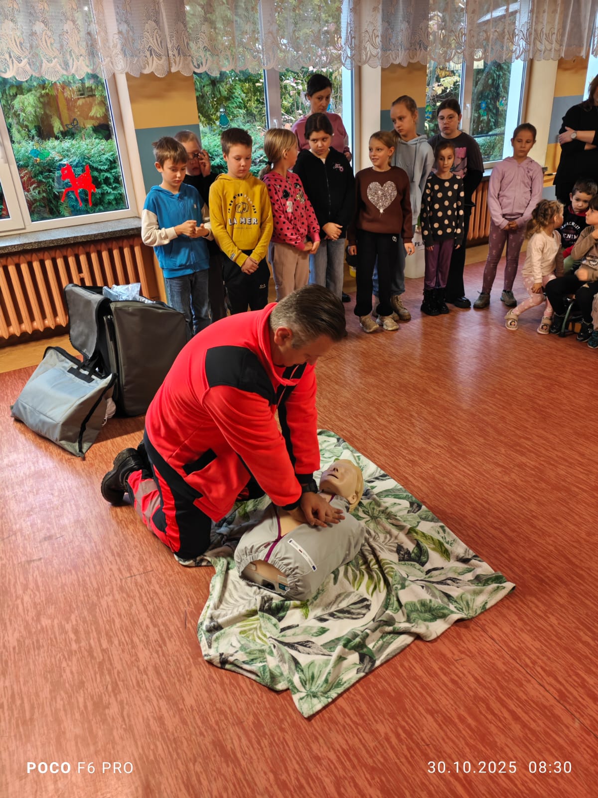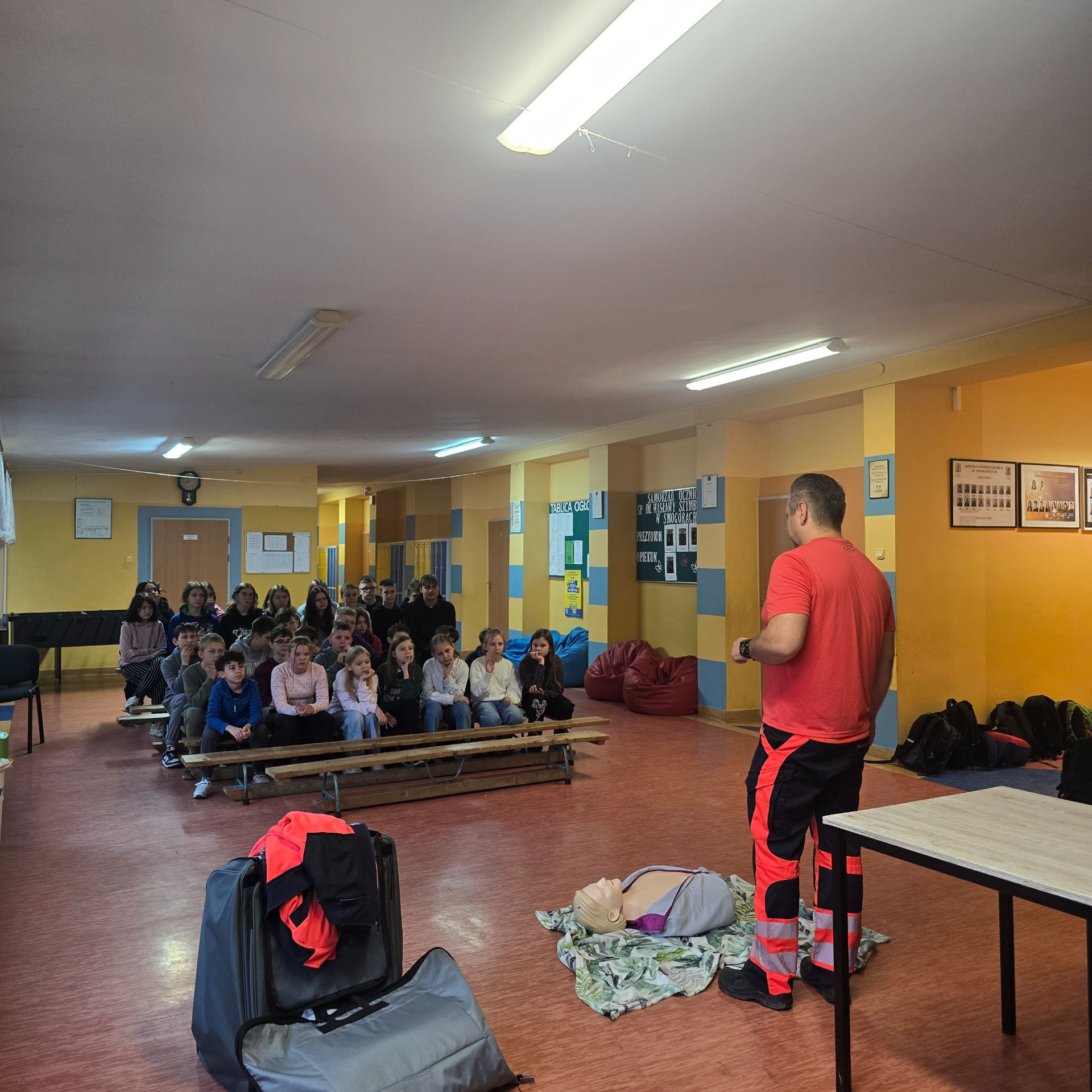 Na spotkaniu udzielał instruktażu oraz zademonstrował tok postępowania podczas udzielania pierwszej pomocy. Ratownik uświadomił uczniom na czym polega jego praca. Jak należy zachować się w nagłych wypadkach do momentu pojawienia się fachowej pomocy medycznej. Uświadomił uczniom, iż tzw. ,,złote minuty” ratują życie poszkodowanego. Przypomniał również ważne numery alarmowe.