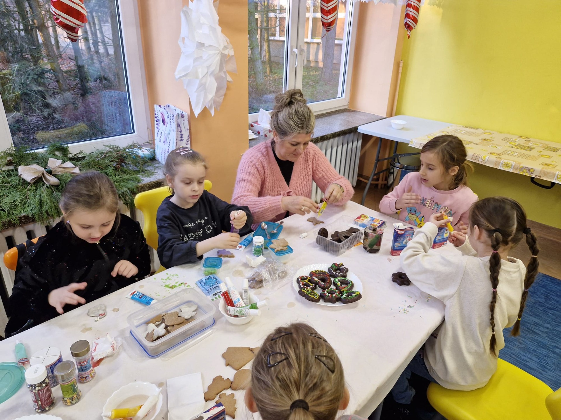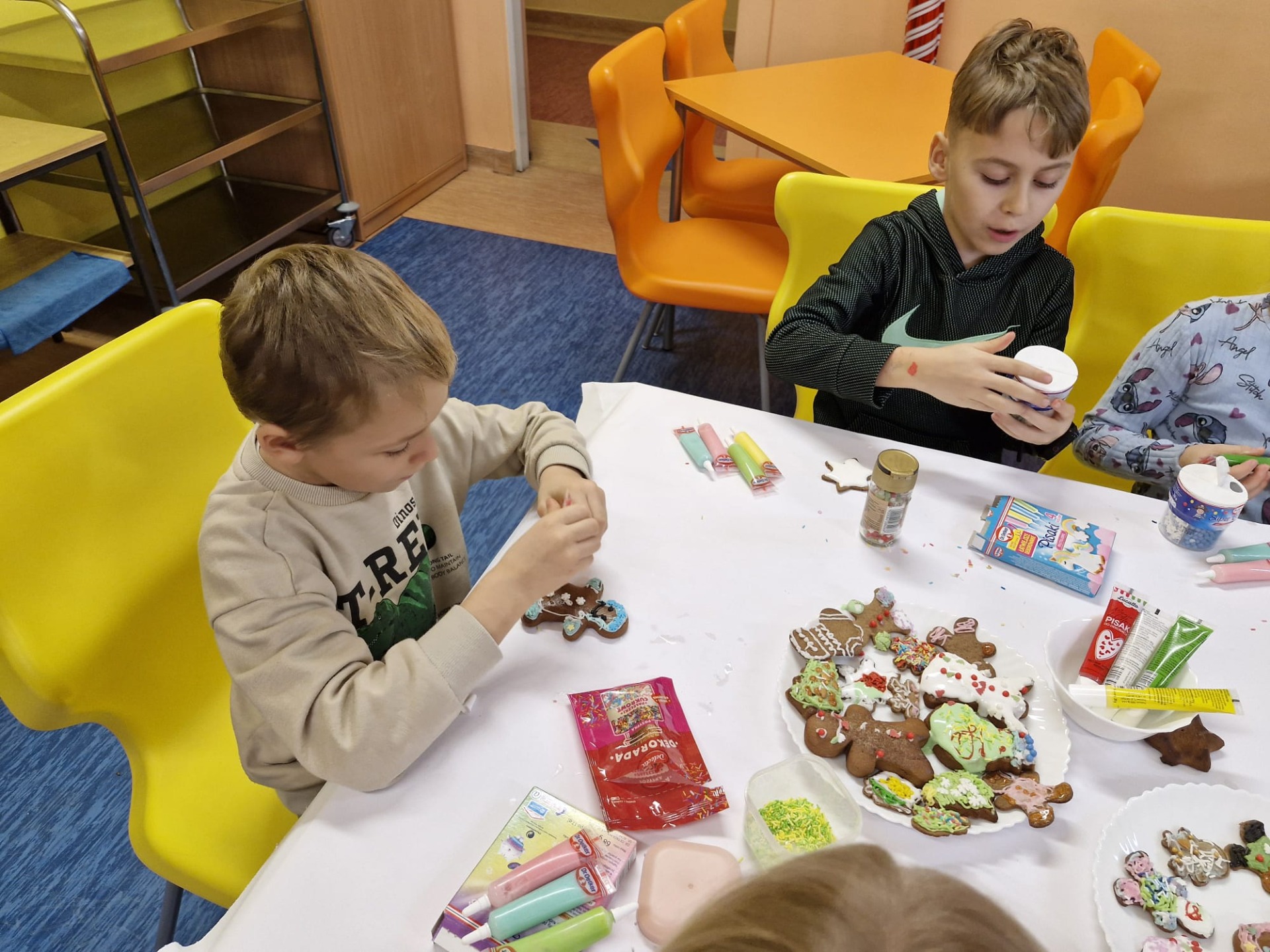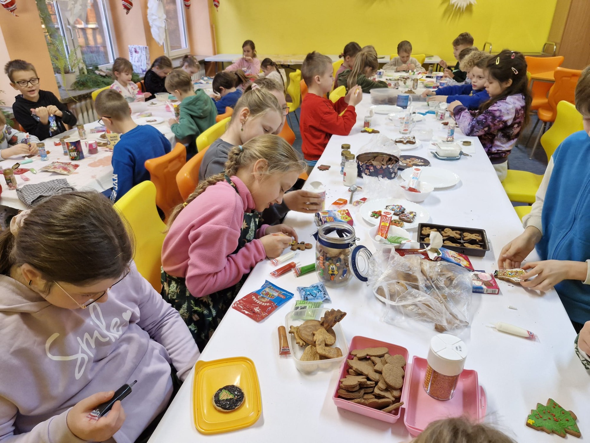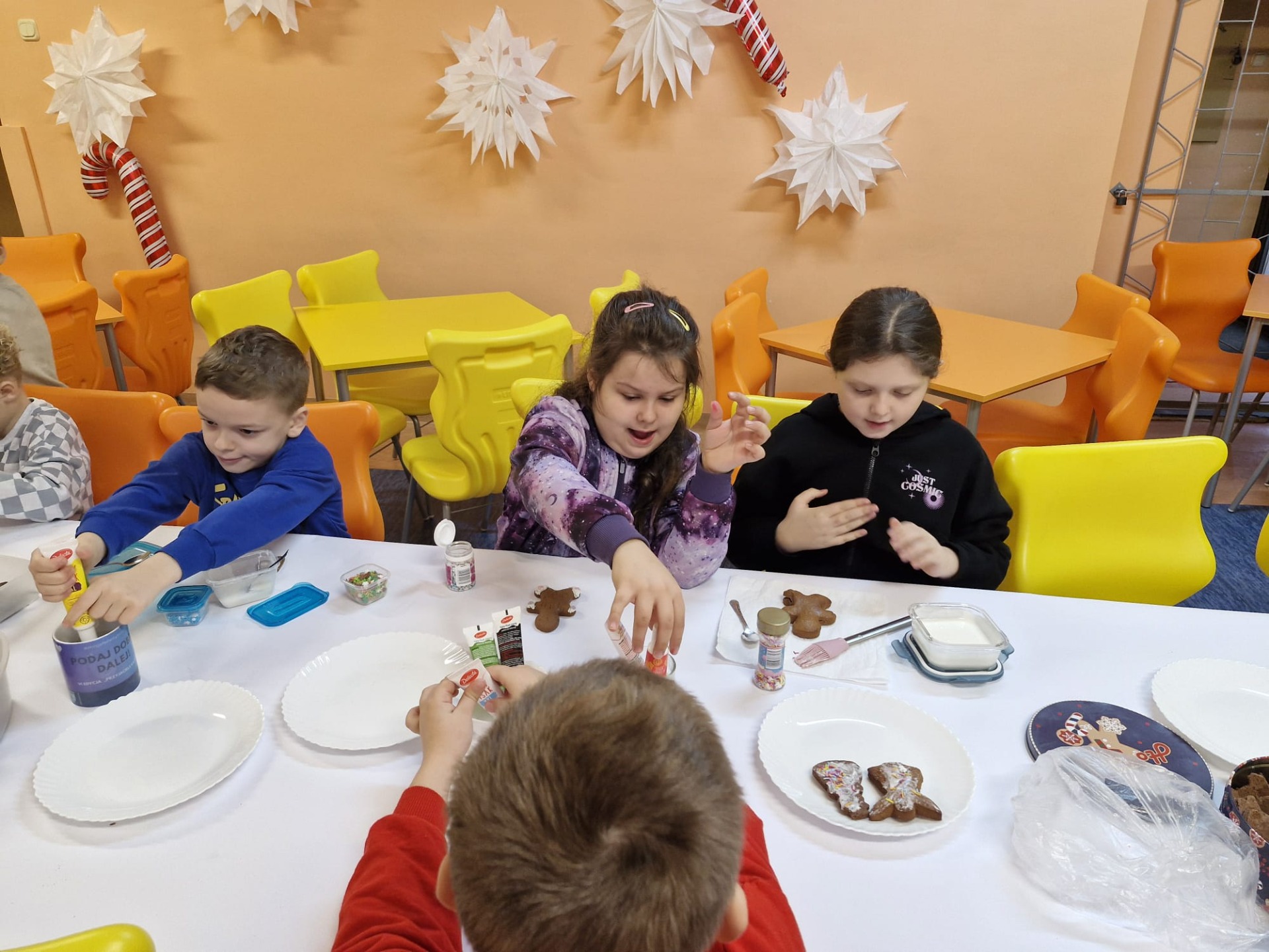 Dzieci z ogromnym zaangażowaniem dekorowały pierniki kolorowymi lukrami, posypkami i innymi ozdobami, tworząc wyjątkowe, niepowtarzalne wypieki. Nie zabrakło uśmiechów, dobrej zabawy i rozmów o tradycjach bożonarodzeniowych.